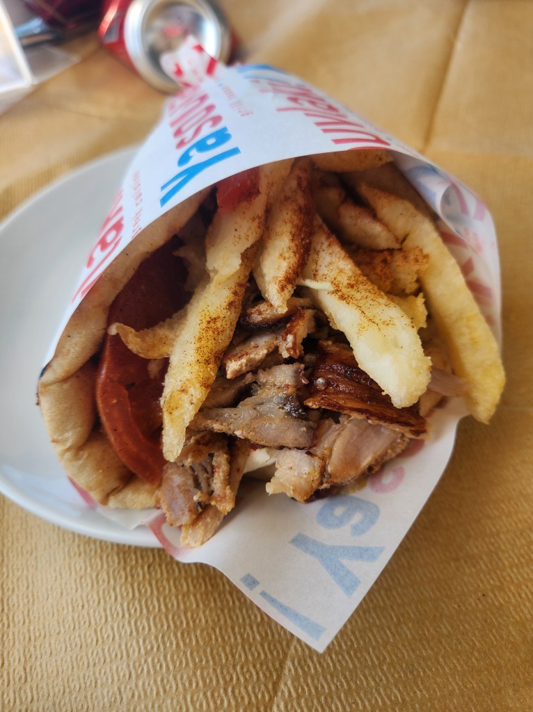 Need a quick and affordable lunch, meet the fast food of Greece…..The Gyro!!! Oh my goodness, this was my most favorite thing in Greece. Shaved chicken or pork, tomato, onion, tzaziki, and fries all wrapped in a warm, fresh baked pita. My mouth is watering as I write this. These are sold on every corner and in almost every restaurant. Basically, walk up to the order window, tell them chicken or pork and in seconds you will be handed a delicious, filling lunch. Frugal tip- Order these from the window shops or stands to save money, the prices we found ranged from 3-4 euros, if you sit and order in the restaurant you will pay 10-15 euros. Add on a drink for 1-2 Euros and you have a filling lunch to power through your day of sightseeing for around 5 euros.