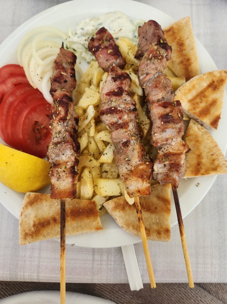 Souvlaki….meat kabobs, typically chicken or pork, wonderfully marinated and tender, usually served as a platter with tomatoes, onion, Tzatziki, fries, and sliced pita….kind a of a “build your own gyro”. You can also grab these at most of the gyro windows (minus all the fixings) as well, just a couple skewers of meat for a couple of euros. My recommendation is to order a Greek salad and souvlaki, add in a yummy glass of wine and you have yourself a healthy and delicious Greek dinner.